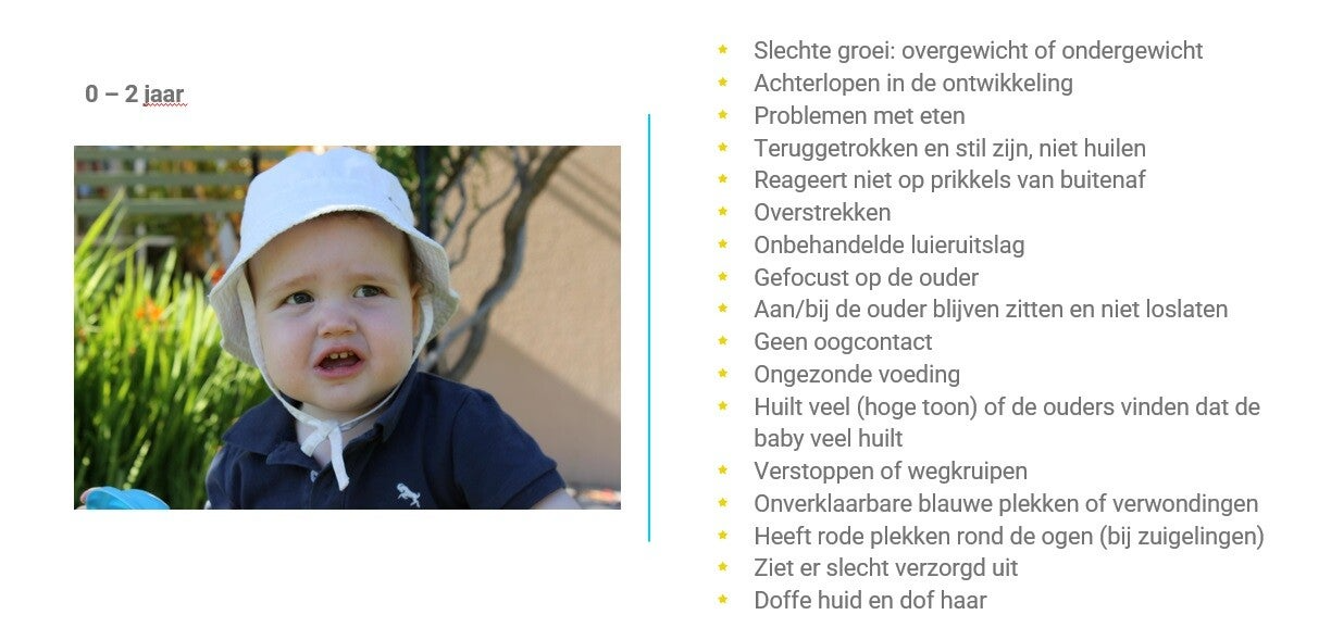 De signalenkaarten hieronder geven een overzicht van wat mogelijke signalen kunnen zijn die erop wijzen dat een kind te kampen krijgt met kindermishandeling.
